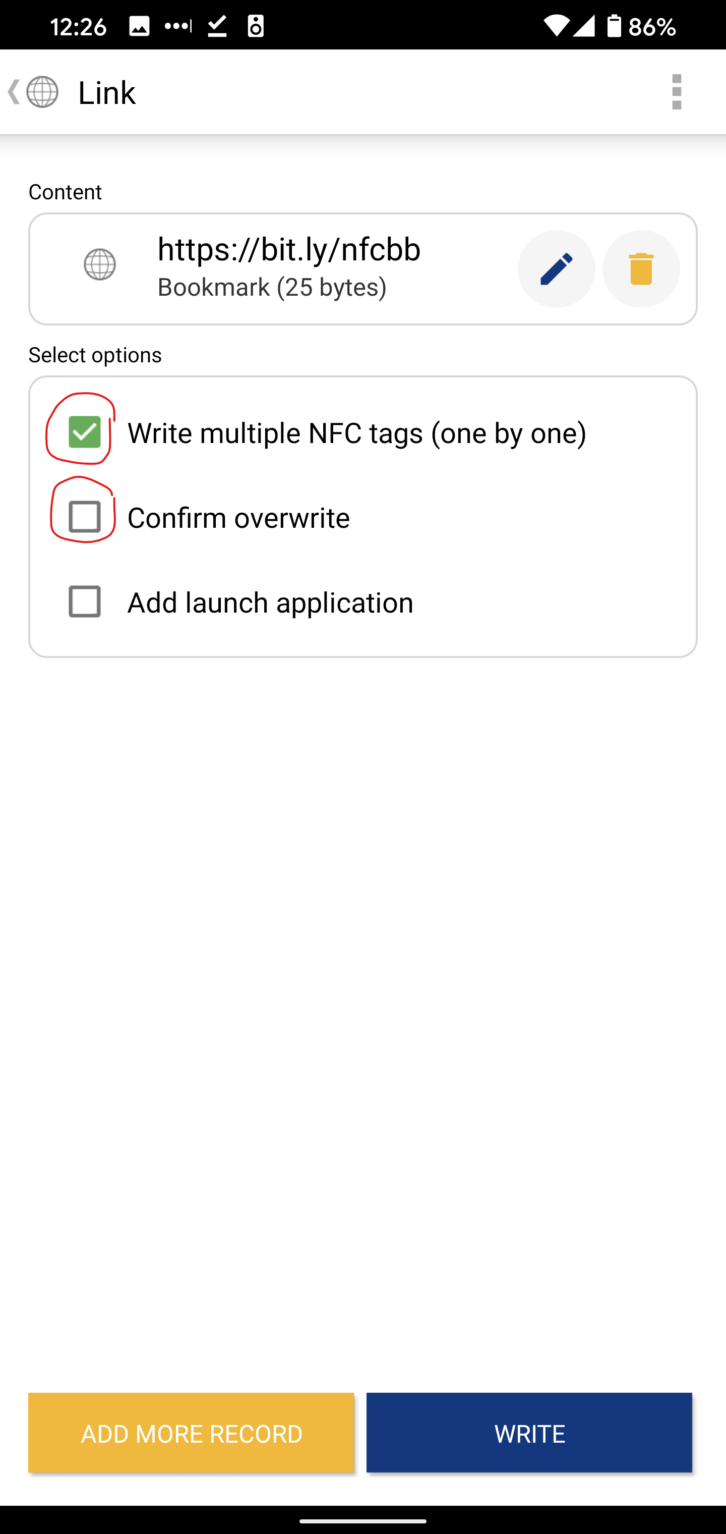 5. Uncheck "Confirm overwrite", and check "Write multiple NFC tags (one by one)"