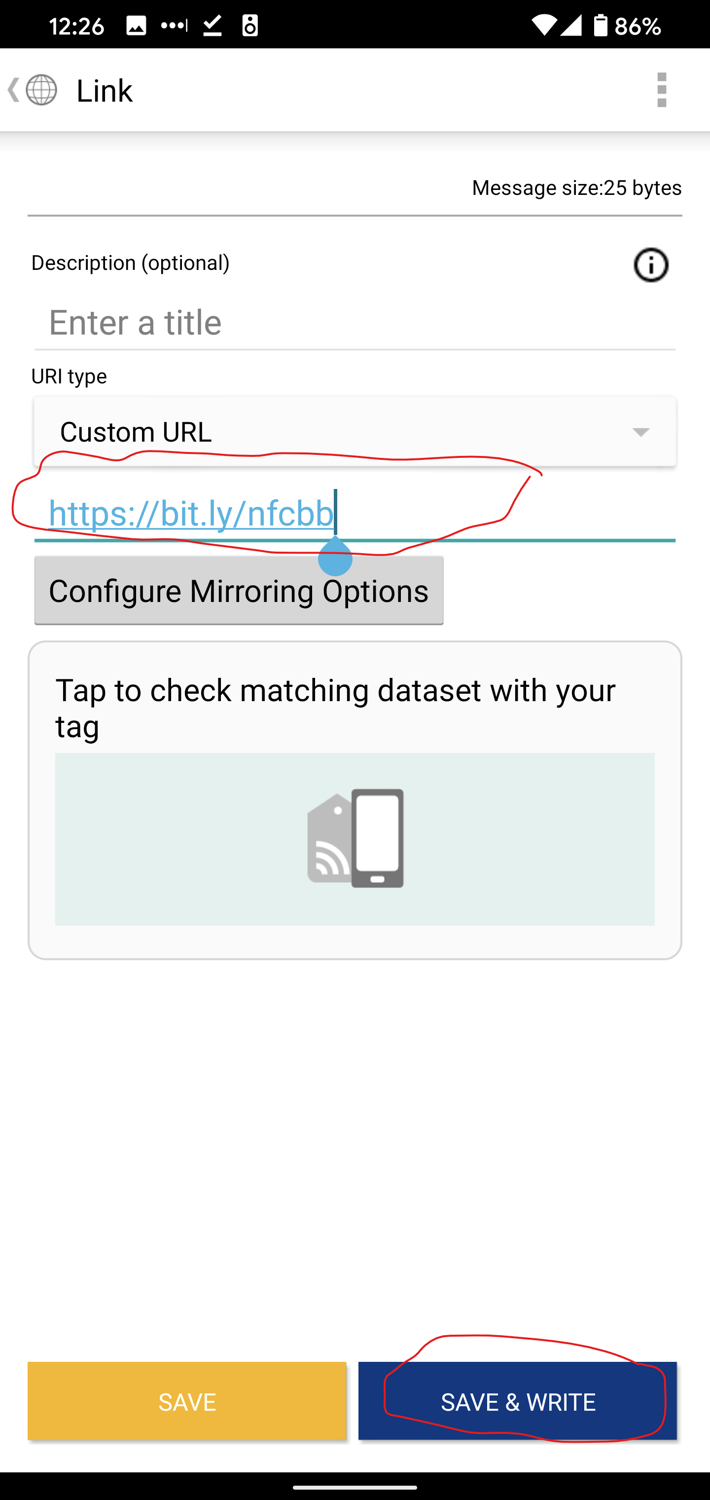 4. Enter URL (in the Blackberry example you can use "https://bit.ly/nfcbb"). When finished click SAVE & WRITE: